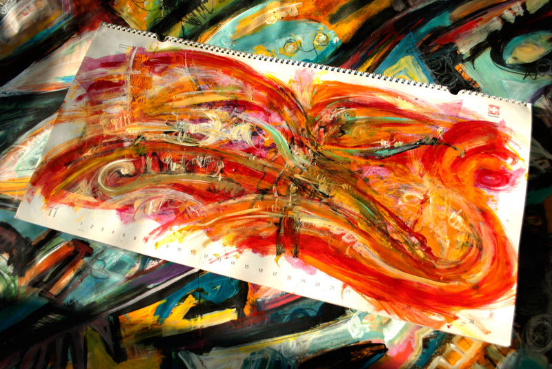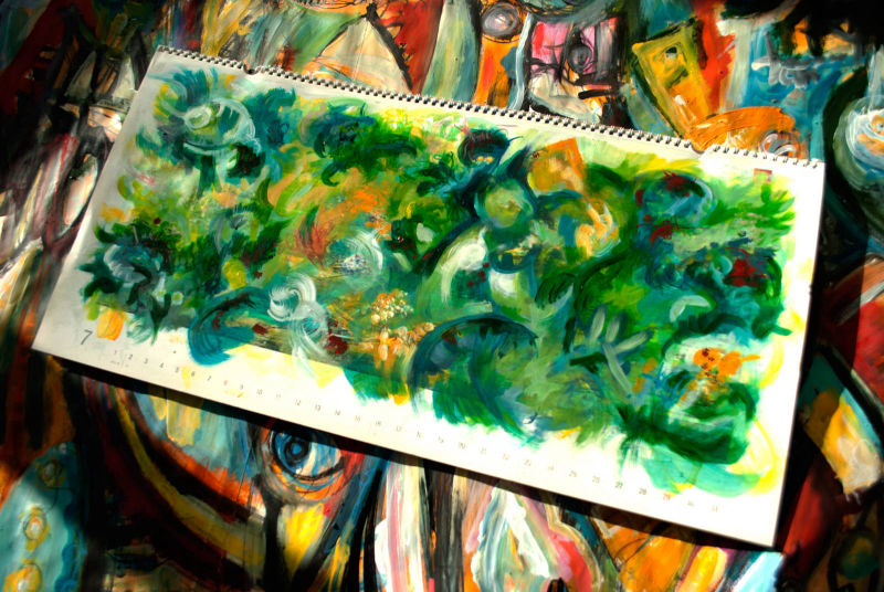 BIG DESENHOS Antes da retomada das telas criei uma série de paisagens em papel com quase 2 metros de altura. Boa parte do suporte era reforçada com camadas de papelão, tecidos e vários tipos de papéis. Acrílicos, lápis, giz pastel, bastões oleosos, colas, fixadores e uma série de outros dispositivos inomináveis trabalhando aleatóriamente na composição. Mantenho esta indisciplina sob um rígido controle pincelar quando passo para as telas. A busca por este fluxo desinibido de consciência, digamos uma sem vergonhice, que o desenho oferece, só se tornou realidade após uma tomada de consciência que levou pelo menos dois anos para se concretizar. Falta muito pouco para que este app seja totalmente incorporado ao meu processo de pintura.