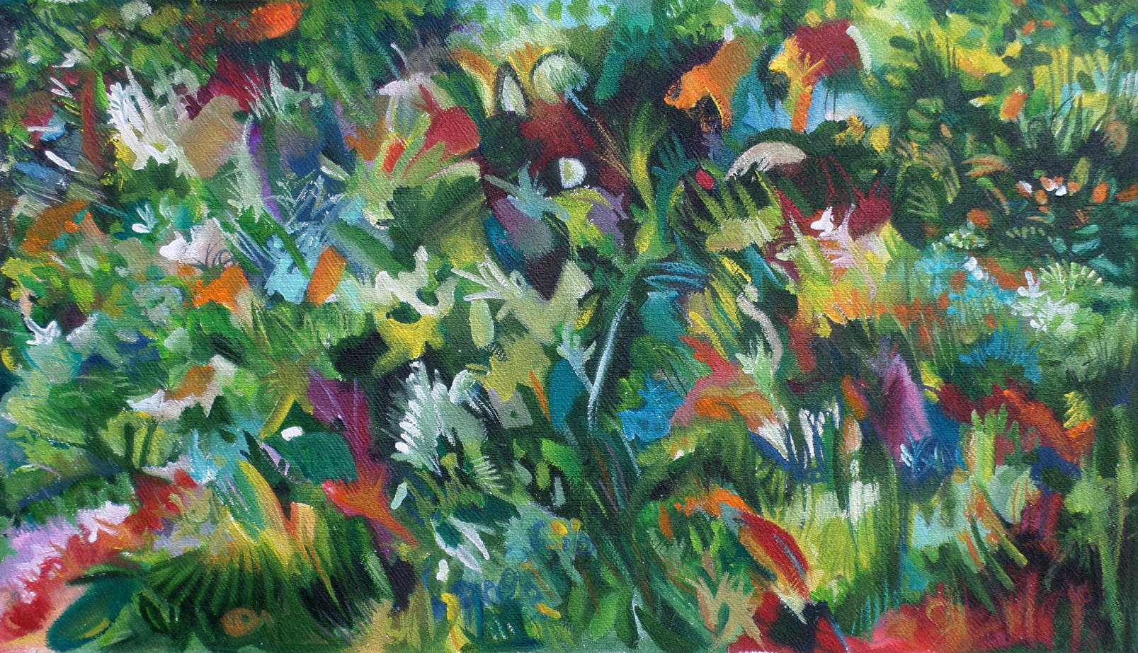 Landscape / Paisagem | 161-051 | 140x190 cm | 2018 O processo criativo para a interpretação destes detalhes que se somam a composição final é o mesmo que o utilizado em todos os trabalhos inclusive os gerados no computador. Interpretar cada detalhe com uma abordagem diferente que contribua para uma composição final. Assim posso pegar uma mesma imagem e gerar dezenas de artes alternativas. O difícil é conseguir manter o fluxo de consciência alerta durante o todo o processo para fugir do processo meramente ilustrativo. Acho eu que há uma linha tenue entre a representação/interprestação do figurativo e o abstrato.